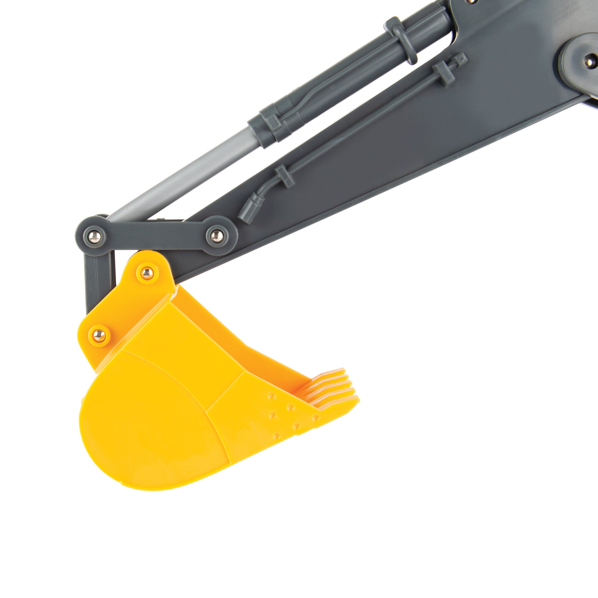 Stock #35802 - all plastic with movable rubber tracks, pivots 360° on base, boom arm raises and extends, bucket tips. Features opening cab door, working lights and engine sounds. Made by TOMY, 24" L x 8" H x 8" W, for ages 3 & up.