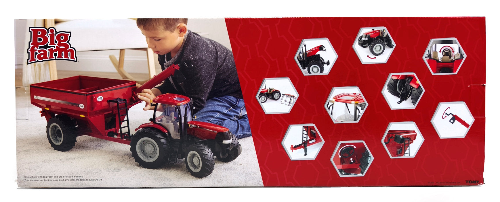 Stock #44459 -  tractor, 12" L x 8" H, features steerable front wheels, opening hood, removable front weights and cab plus working lights and tractor sounds. Hitch is compatible with all Big Farm Series implements and many die-cast Ertl implements. Grain cart, 18" L x 9" H x 9½" W, has movable working unloading auger, opening grain box door and adjustable jack stand. Big Farm Series, all plastic with rubber tires, made by TOMY, for ages 3 & up.