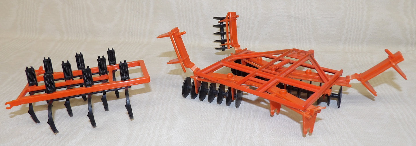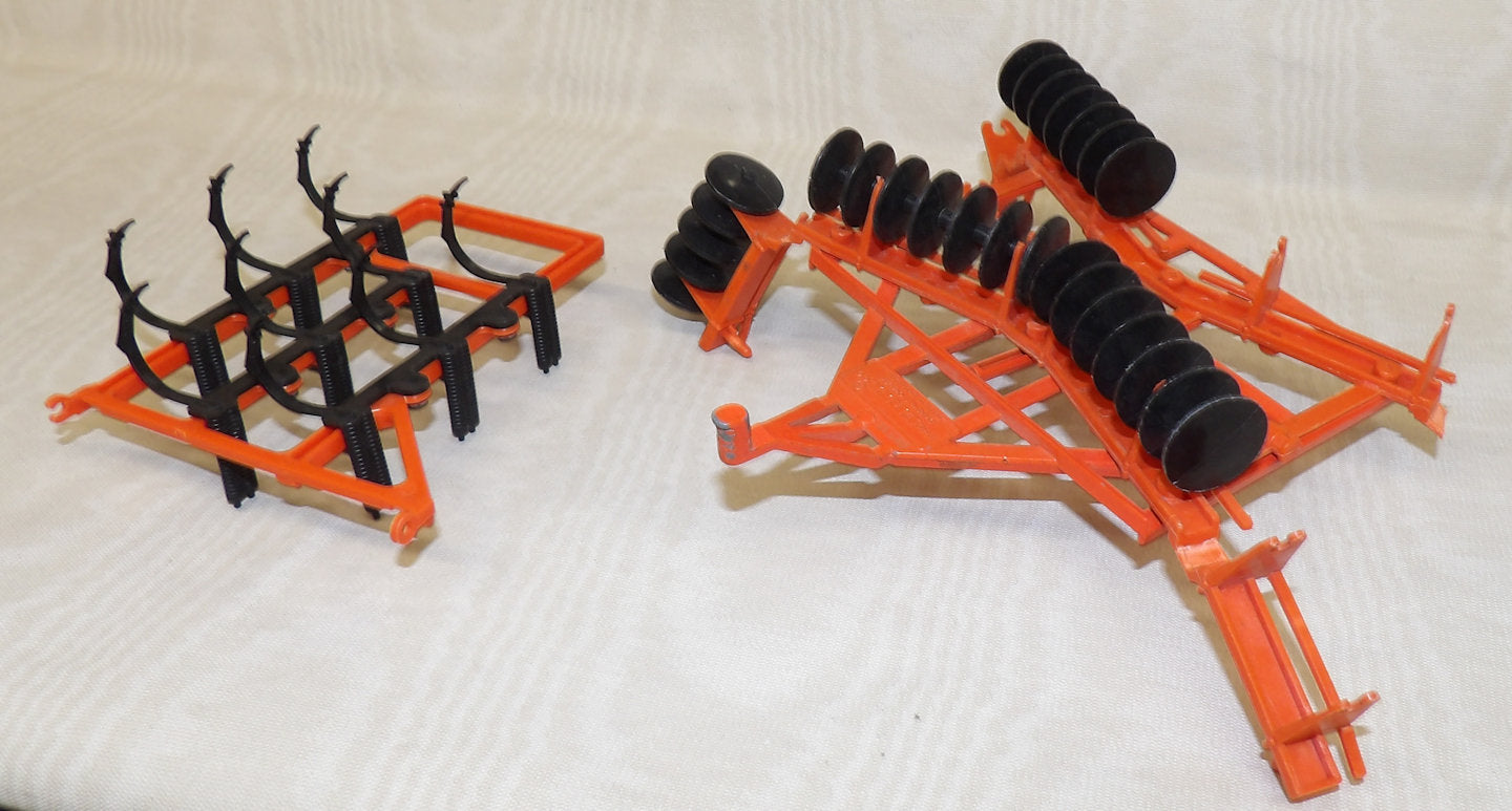 Stock #SY147 - one wing off a minimum tillage plow, all plastic frame and shears. Wing disk is missing one wing and some discs, metal frame with plastic wings and discs, assorted paint chips. Made by Ertl, no packages. Vintage, older out of production items. AS IS.