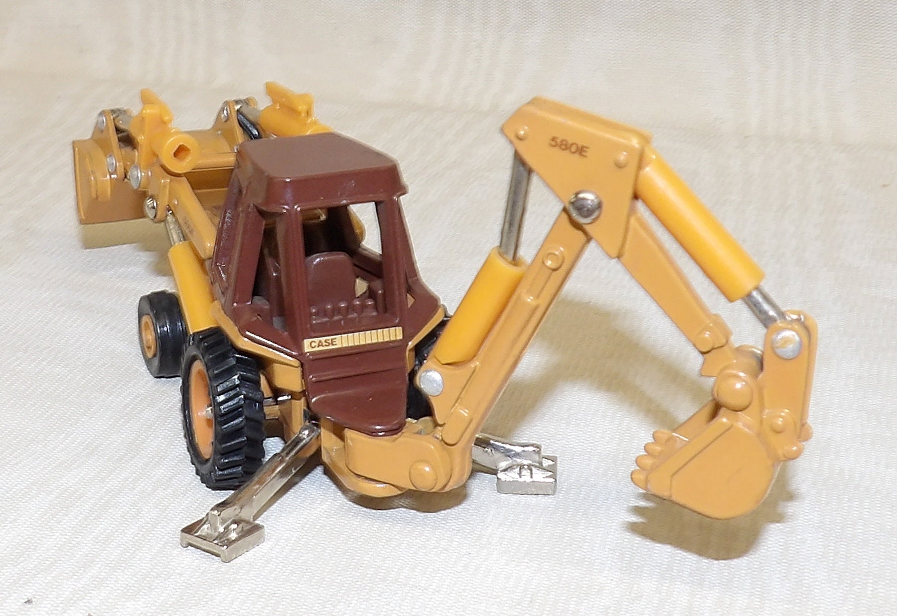 Stock #202EA - die-cast metal with plastic tires, fold-down stabilizer arms, loader raises & bucket dumps, back hoe pivots, extends and bucket dumps. In good condition with small paint chips on cab, left bottom cylinder has crack along side. Made in 1990 by Ertl, 5¼" L x 1¾" H x 1½" W, for ages 14 & up. Item is out of a private collection. Vintage, older out of production toy. No package, AS IS.