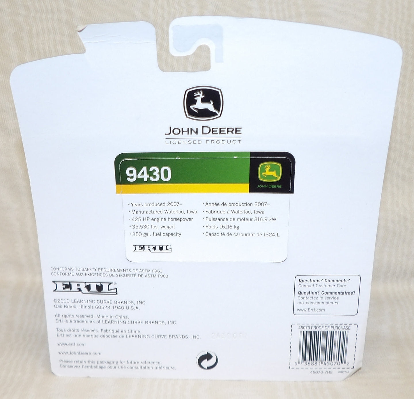 Stock #45070 - die-cast metal with triple rubber tires, articulated steering, clear cab windows, standard hole-style hitch, includes collector card. Made in 2010 by Ertl, new in the package, 4½" L x 2¼" H x 3" W, for ages 3 & up. Vintage, older out of production toy. AS IS.