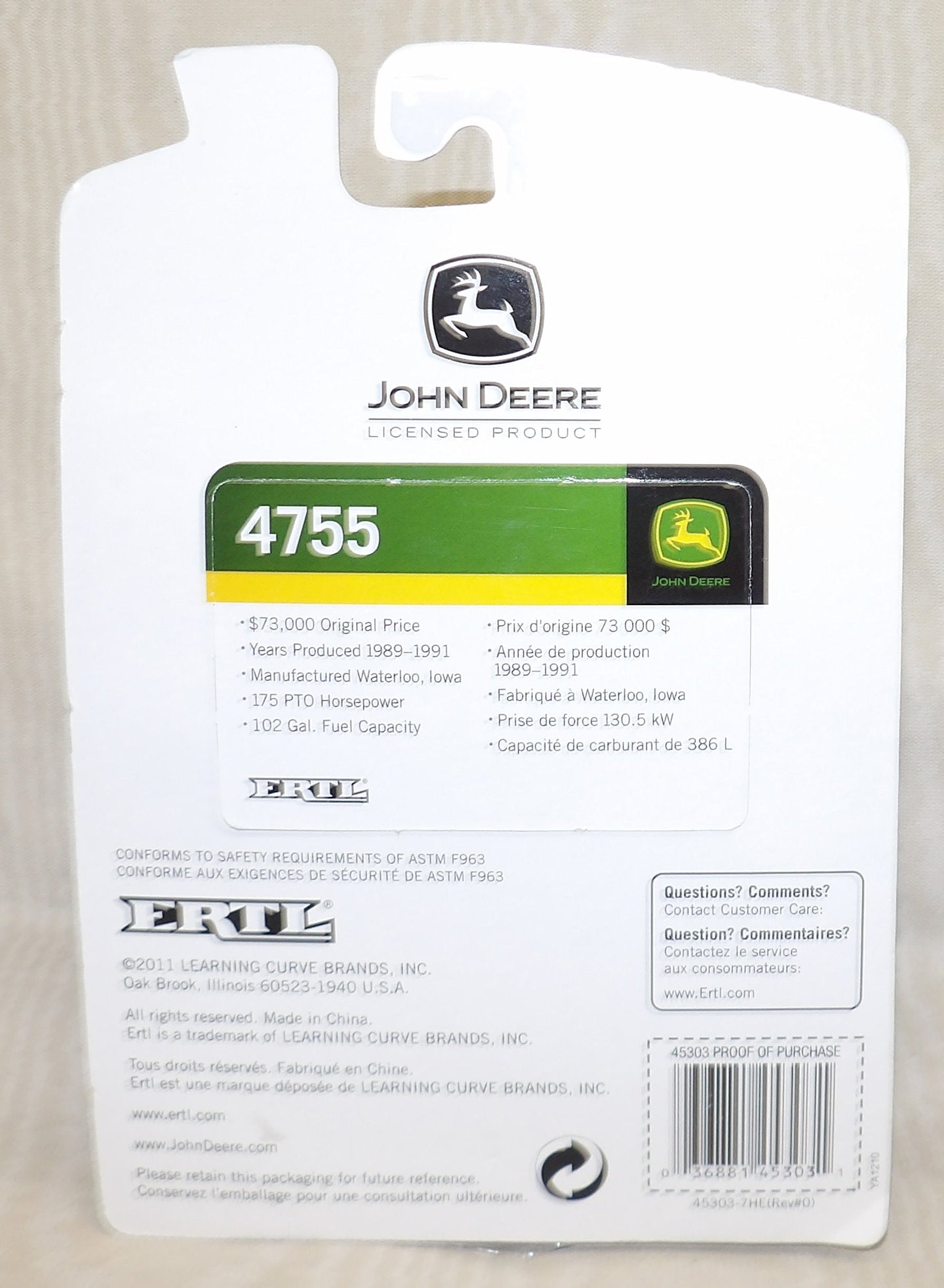 Stock #45303 - die-cast metal with rubber tires, plastic front fenders, clear cab windows, standard hole-style hitch, includes collector card. Package has mark on front from a removed price tag. Made in 2011 by Ertl, new in the package, 3" L x 2" H x 2¼" W, for ages 3 & up. Vintage, older out of production toy. AS IS.