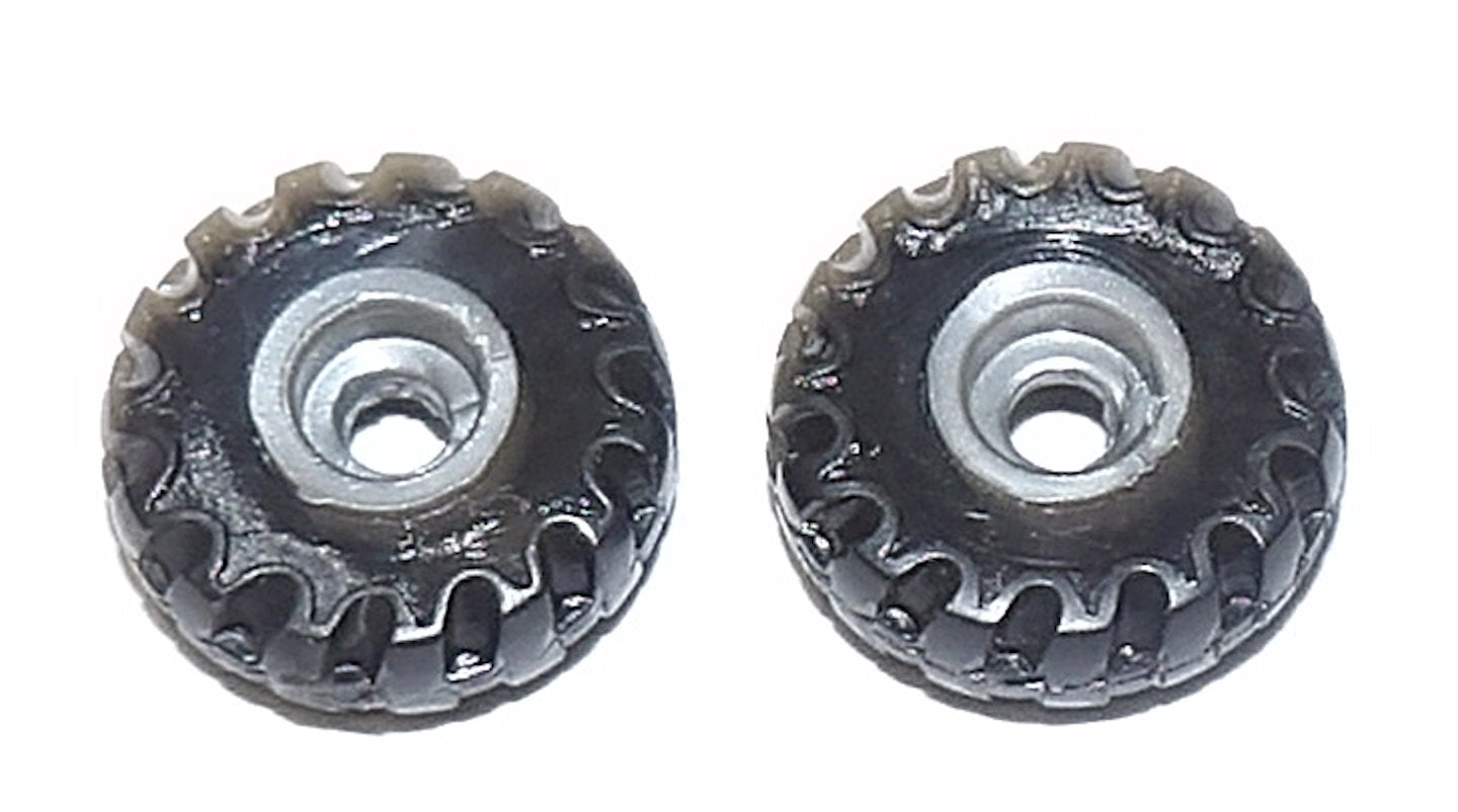 Stock #SY228 - 2 plastic tires with plastic rims, 9/16" round x 1/4" wide, 1/8" axle hole. From an Ertl tractor, in new condition.