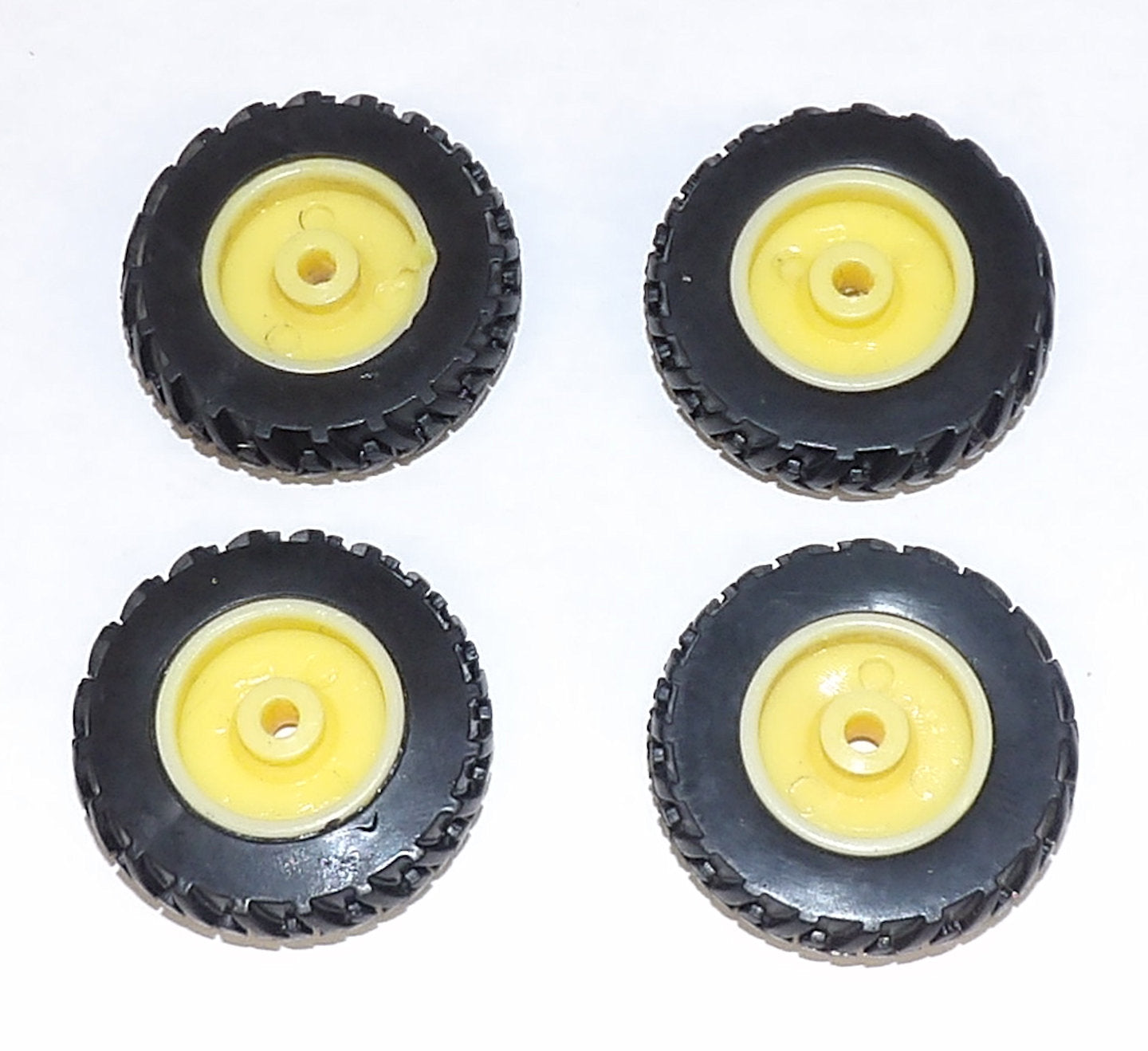 Stock #SY232- rear dual set off an Ertl tractor. Includes 4 rubber tires with plastic rims, 1 1/8" round x 1/4" wide, 1/8" axle hole. Used, AS IS.