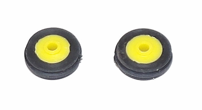 Stock #SY233 - 2 rubber tires with plastic rims, 1/2" round x 3/16" wide, 1/8" axle hole.