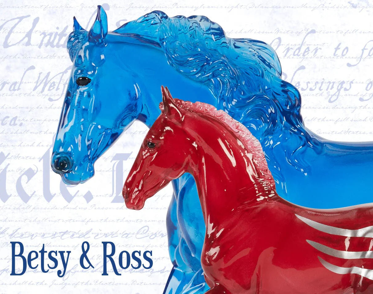 Stock #B-TR-10671 - Created in honor of America’s Semiquincentennial, Betsy & Ross are a special edition Mustang mare and foal that celebrate 250 years of American history. Inspired by the legendary Betsy Ross, the upholsterer credited with sewing the first American flag. Molded in translucent clearware, Betsy and her foal, Ross, gallop with determination and shine with vibrant patriotic colors. 1/9 Traditional size, made by Breyer, mare is 11½" L x 8¼" H, foal is 6½" L x 6½" H, for ages 8 & up.