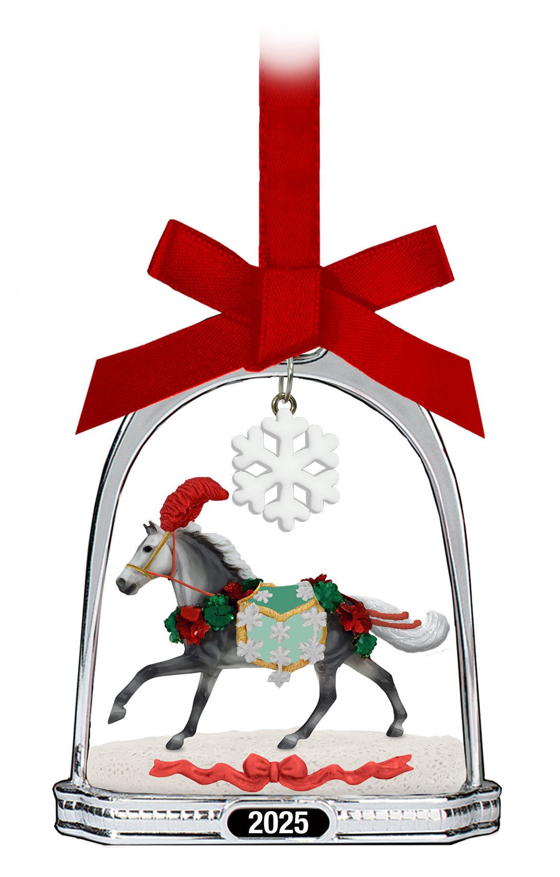 Stock #B-HP-10224 - A finely-detailed miniature of Christmas in Bloom is perfectly framed within a silver tone stirrup. This athletic sport horse features beautiful hellebore blooms, also known as "Christmas Roses" decorating his festive tack. A snowflake dangles from the top of the stirrup to finish this charming piece. The 26th in a collectible series. Made by Breyer, 3½" H x 2¾" W, for ages 8 & up.