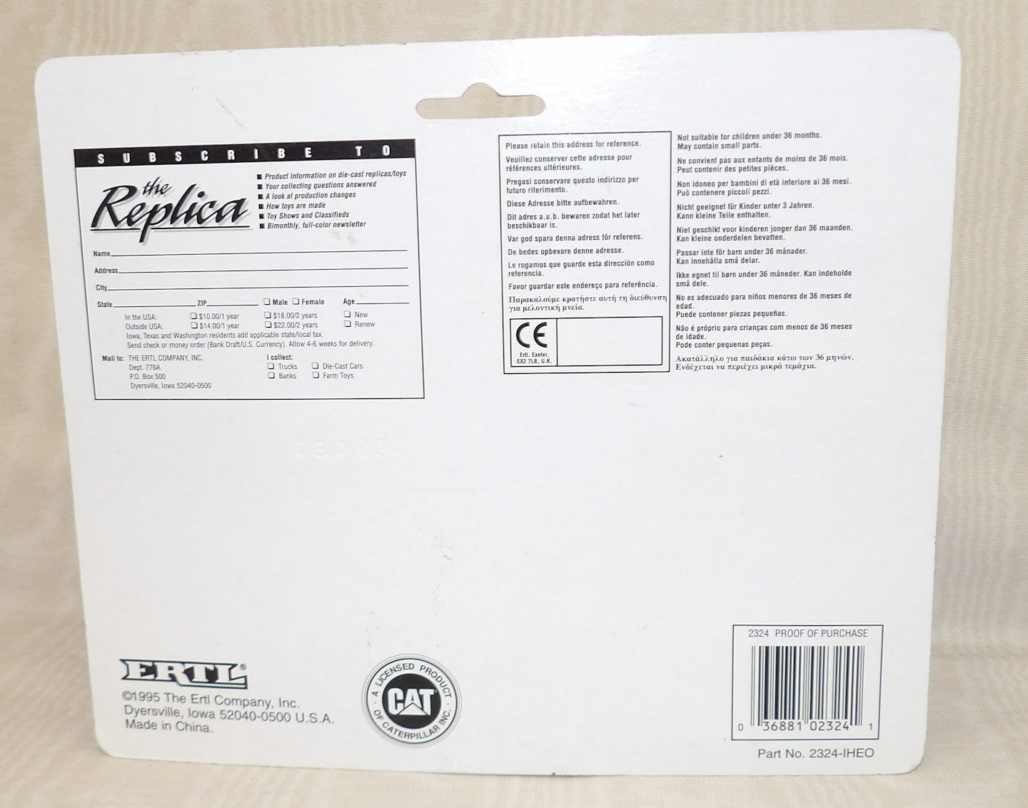 Stock #2324EO - die-cast metal frame with movable rubber tracks, removable plastic sludge tank. Tank slides back and then lifts up to remove. In new condition, the bubble packaging has been cut open on the top. Made in 1995 by Ertl, 4½" L x 2" H x 1¾" W, for ages 3 & up. Vintage, older out of production toy. Opened packaging, AS IS.