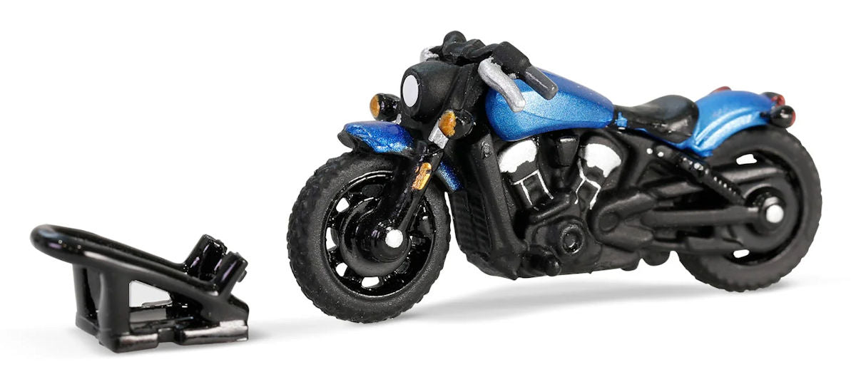 Stock #32320-C - die-cast metal Velocity Blue Metallic Bronco with rubber tires, bumper hitch and removable roof top. Trailer is die-cast metal & plastic with rubber tires, fold-down ramp and adjustable trailer stand. Motorcycle, 1¼" L x 1/2" H, has removable bike stand. Hitch & Tow Series Release 32, made by Greenlight Collectibles, 5½" L x 1¼" H, for ages 14 & up.