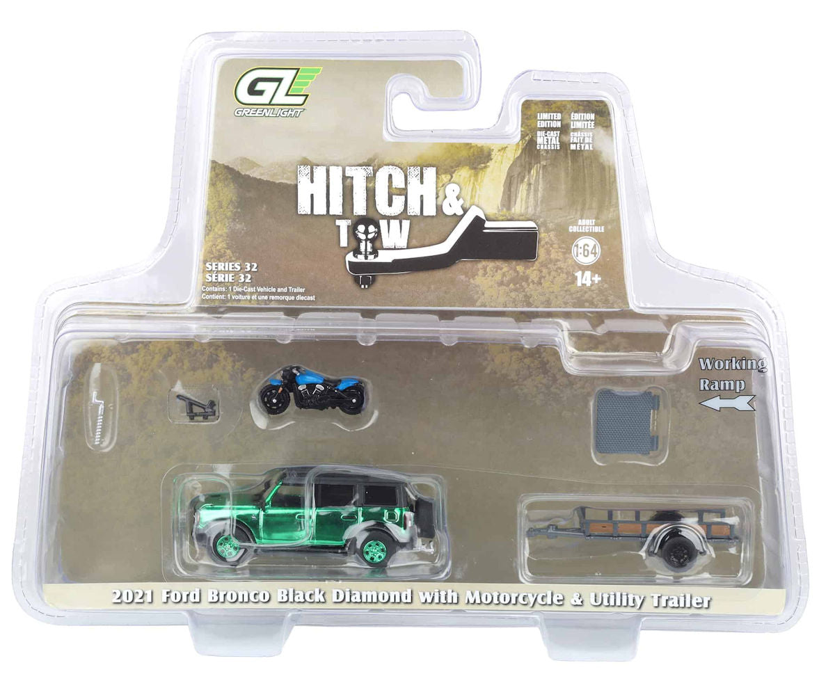 Stock #32320-CG - Green Machines Chase version, die-cast metal Green Chrome Bronco with rubber tires, bumper hitch and removable roof top. Trailer is die-cast metal & plastic with rubber tires, fold-down ramp and adjustable trailer stand. Motorcycle, 1¼" L x 1/2" H, has removable bike stand. Hitch & Tow Series Release 32, made by Greenlight Collectibles, 5½" L x 1¼" H, for ages 14 & up.