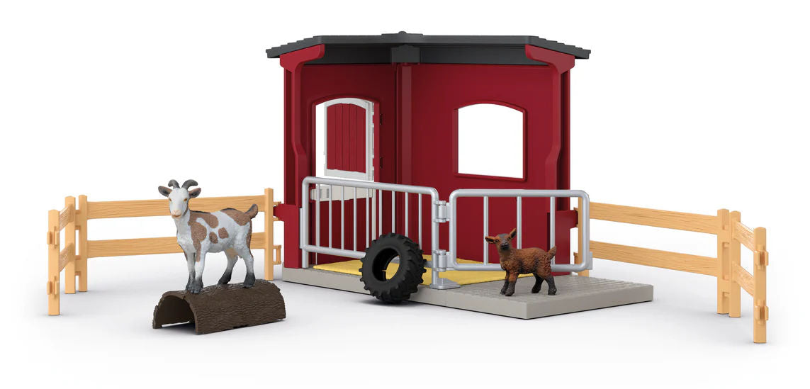 Stock #42726 - The goat and her little goat kid are very comfortable in the pretty, red goat stable. The kid can play on the tire or seesaw while his mother is snacking on fresh vegetables. The stable features an opening front barn door and includes 5 brown fence sections and 2 silver fence sections. Other accessories include goat, kid goat, tub, log, assorted vegetables, sticker sheet and set-up instruction. The stable can be attached to the large farm (42606), large stable (42605) and pony boxes (42724 + 42609) all sold separately. All plastic, made by Schleich, 7" L x 7" H x 5" W, for ages 3 & up.