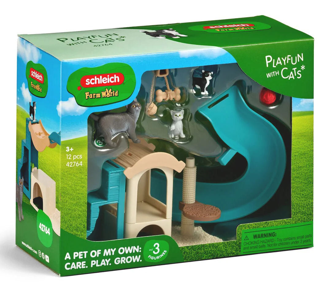Stock #42764 - The two kittens dash down the slide like two whirlwinds, jump from there onto the scratching post and disappear into the little house in one leap. The roof of the cat house is removable and can be used as a seesaw. The ramp and stairs can be moved individually. Set includes cat playground, cat, 2 kittens and 2 play accessories. All plastic, playground is 8½" L x 3½" W x 4" H, made by Schleich, for ages 3 & up.