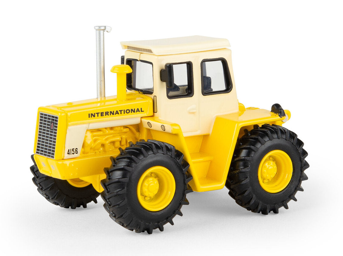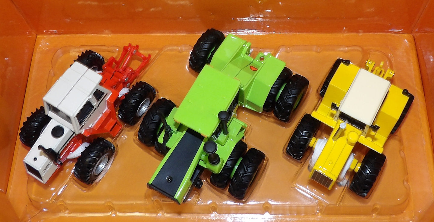 Stock #44524 - Toy Tractor Times 42nd Anniversary Edition, limited one-time production Die-cast metal with rubber tires. Set includes Case 2670 Traction King, 3¾" L x 2" H x 2" W, with single wheels, rigid frame, hole-style hitch with non-movable plastic 3-point. The Steiger Bearcat IV KM-225 tractor, 4¼" L x 2¼ H x 2¾" W, has dual rubber tires, articulated steering and hole-style hitch.  The International 4156 tractor, 3½" L x 2" H x 2" W, is painted industrial yellow with single rubber wheels, rigid frame and hole-style hitch with movable 3-point. All made by Ertl, for ages 14 & up.