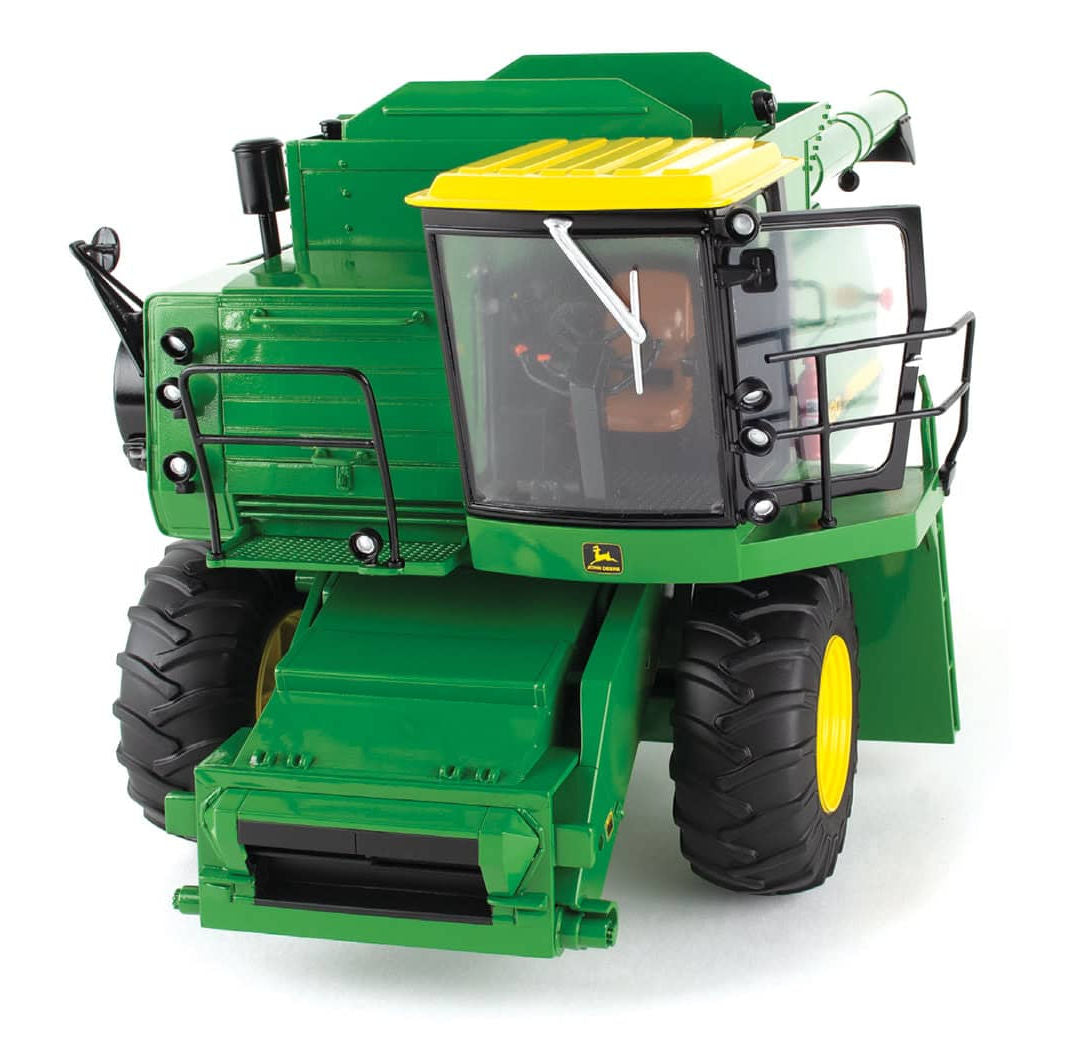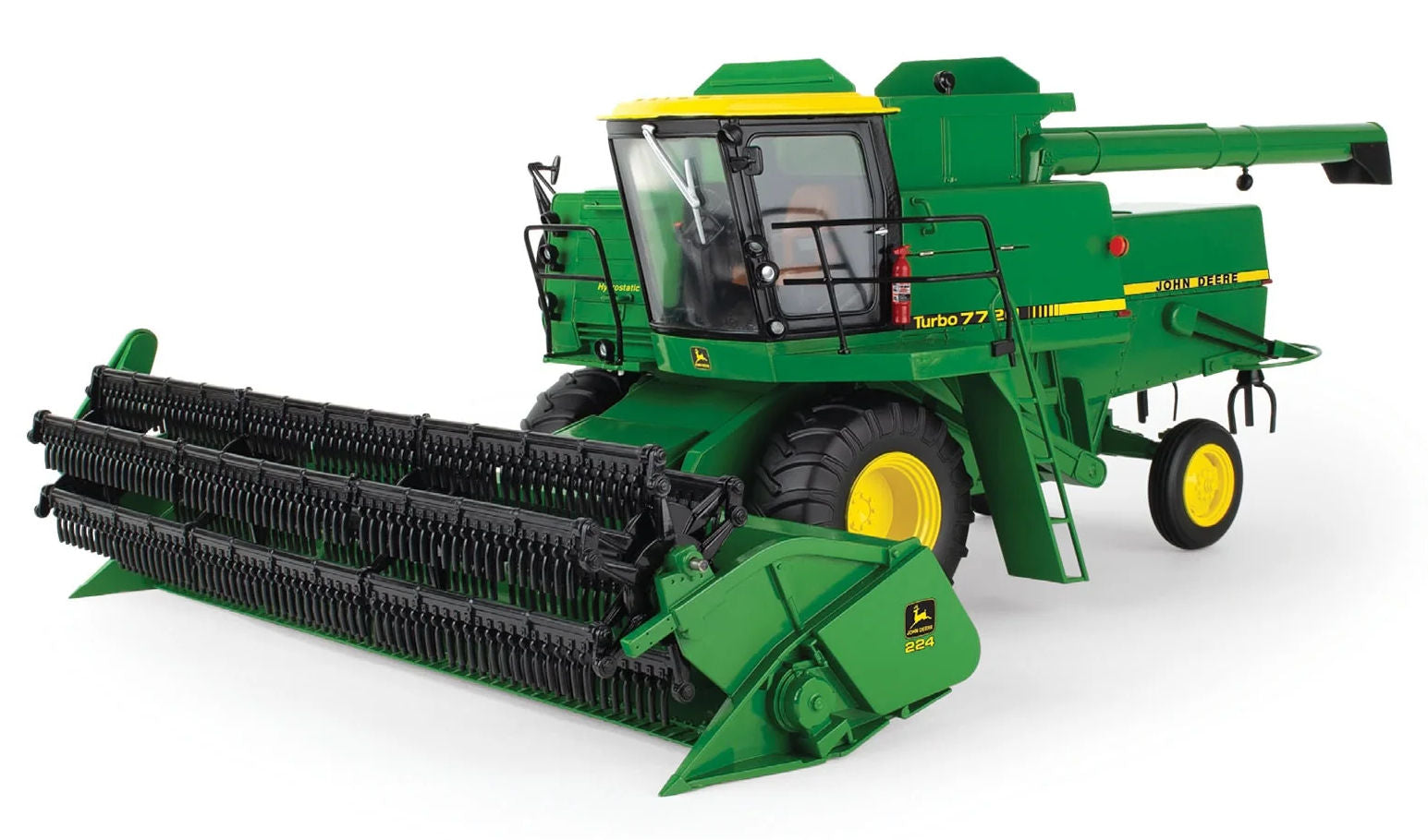 Stock #45961 - #4 in John Deere Prestige Select Series, one-time production - tooling will be destroyed after production. The Turbo version features a yellow roof, 2WD rear axle configuration and a rear stalk spreader. It comes with a die-cast metal 643 6-row low tin corn head and die-cast metal 224 24-foot "finger/tine" grain head. Die-cast metal body, feeder housing, unloading auger and rear axle. Features clear cab windows, opening cab door, detailed cab interior, hinged front ladder, pivoting unloading auger, feeder housing raises and lowers and opening engine panel. Made by Ertl, approximate dimensions with corn head is 26½" L x 12" W, for ages 14 & up. Not designed or recommended for child's play.