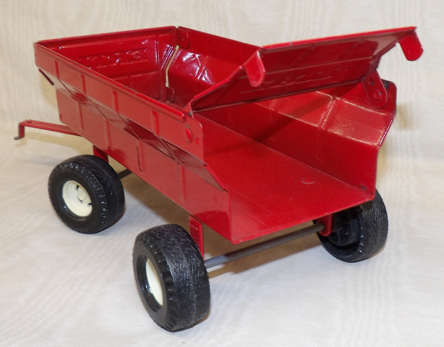 Stock #488FO - all pressed steel body with metal axles, plastic tires, opening end gate. Has a few paint chips an wear marks on top edges and end of hitch. Made in 1993 by Ertl, no box, 10½" L x 4" H x 4"W, for ages 3 & up. Vintage, older out of production toy. Used, no box, AS IS.
