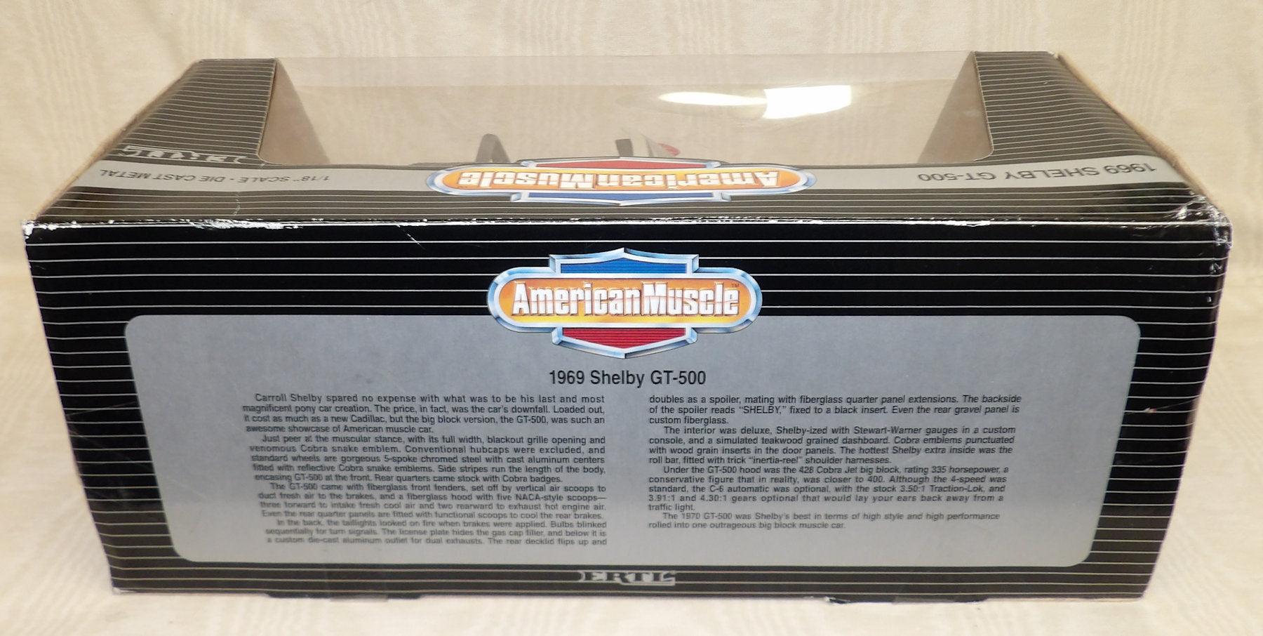 Stock #7350 - Candyapple Red with Gold GT-500 stripes. Die-cast metal with rubber tires, steerable front wheels, opening doors and hood, 428 Cobra Jet big block engine. Car is in new condition, box has some wear on the edges. Made in 1995 by Ertl, 9¾" L x 3" H, for ages 8 & up. Item is out of a private collection. Vintage, older out of production toy. AS IS.
