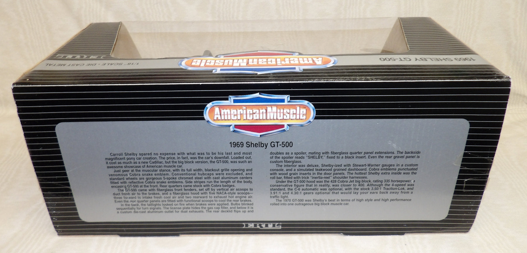 Stock #7351 - Grabber Yellow with Black GT-500 stripes. Die-cast metal with rubber tires, steerable front wheels, opening doors and hood, 428 Cobra Jet big block engine. Car is in new condition, box has some wear on the edges. Made in 1995 by Ertl, 9¾" L x 3" H, for ages 8 & up. Item is out of a private collection. Vintage, older out of production toy. AS IS.
