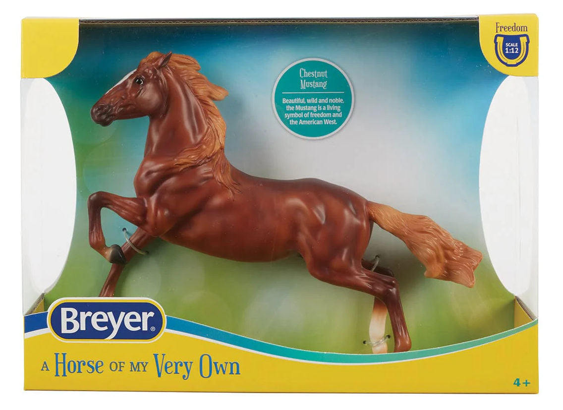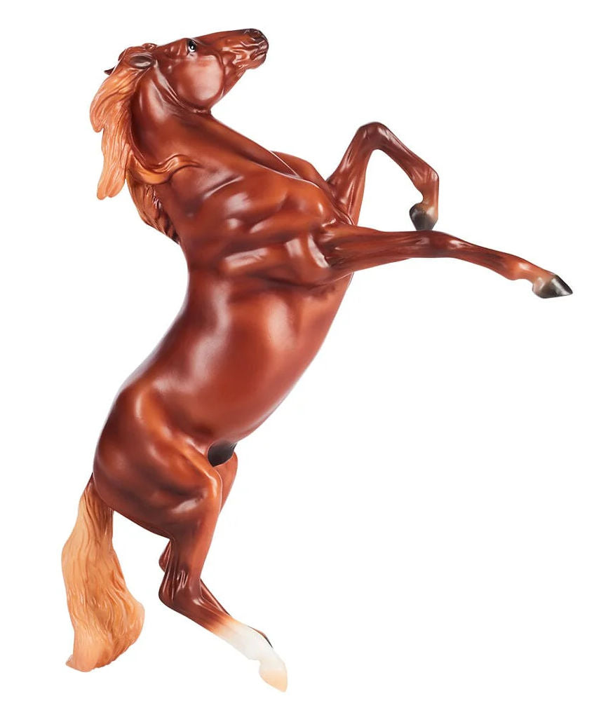 Stock #B-FS-10609 - Wild and noble, Mustangs stand as powerful symbols of freedom and the American West. Captured in a dynamic rearing pose, this chestnut stallion is a picturesque example of his breed's undeniable spirit. 1/12 scale Freedom Series, made by Breyer, 9" H x 5" W, for ages 4 & up.
