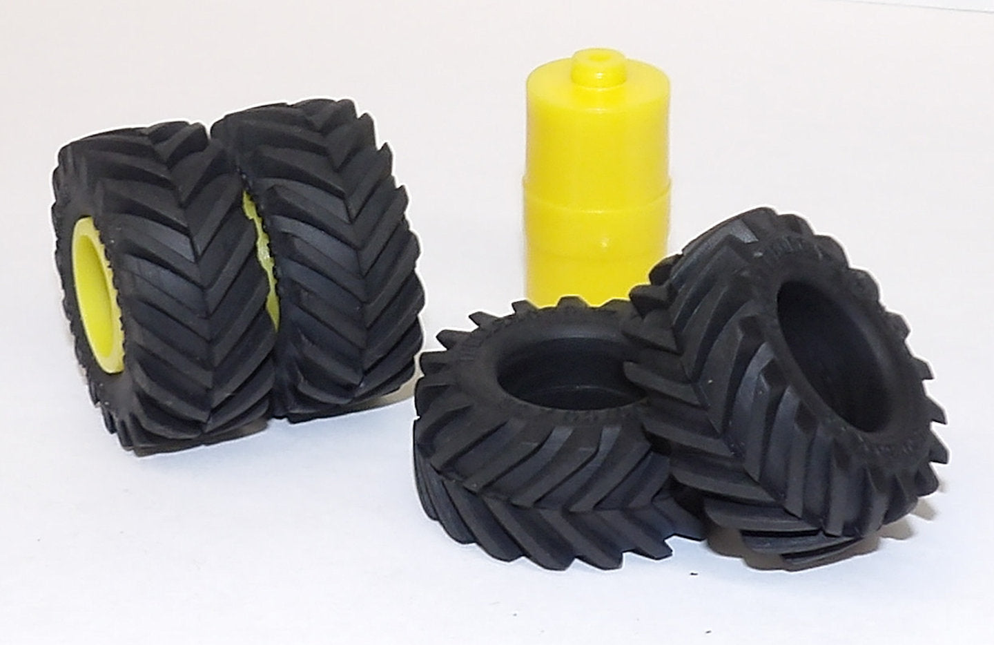 Stock #SY213 - pair includes 4 rubber tires, 1 3/16" high x 9/16" wide,  and 2 plastic dual rims, 1 3/16" wide x 5/8" high, 1/8" axle hole.