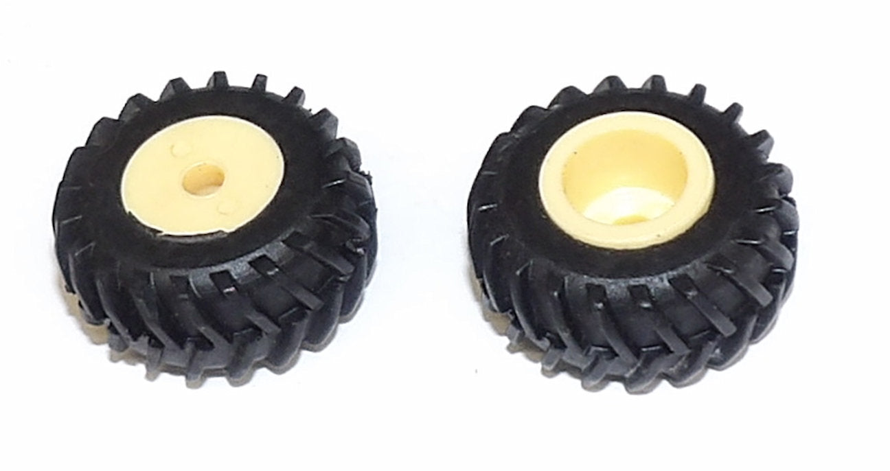 Stock #SY222 - pair includes 2 rubber tires and 2 plastic rims, 1" high x 1/2" wide, 1/8" axle hole.